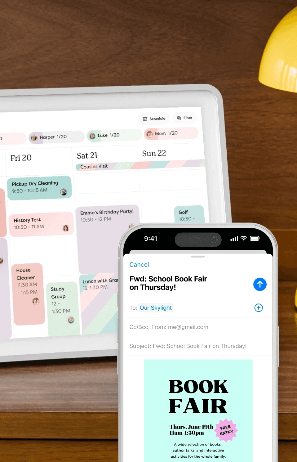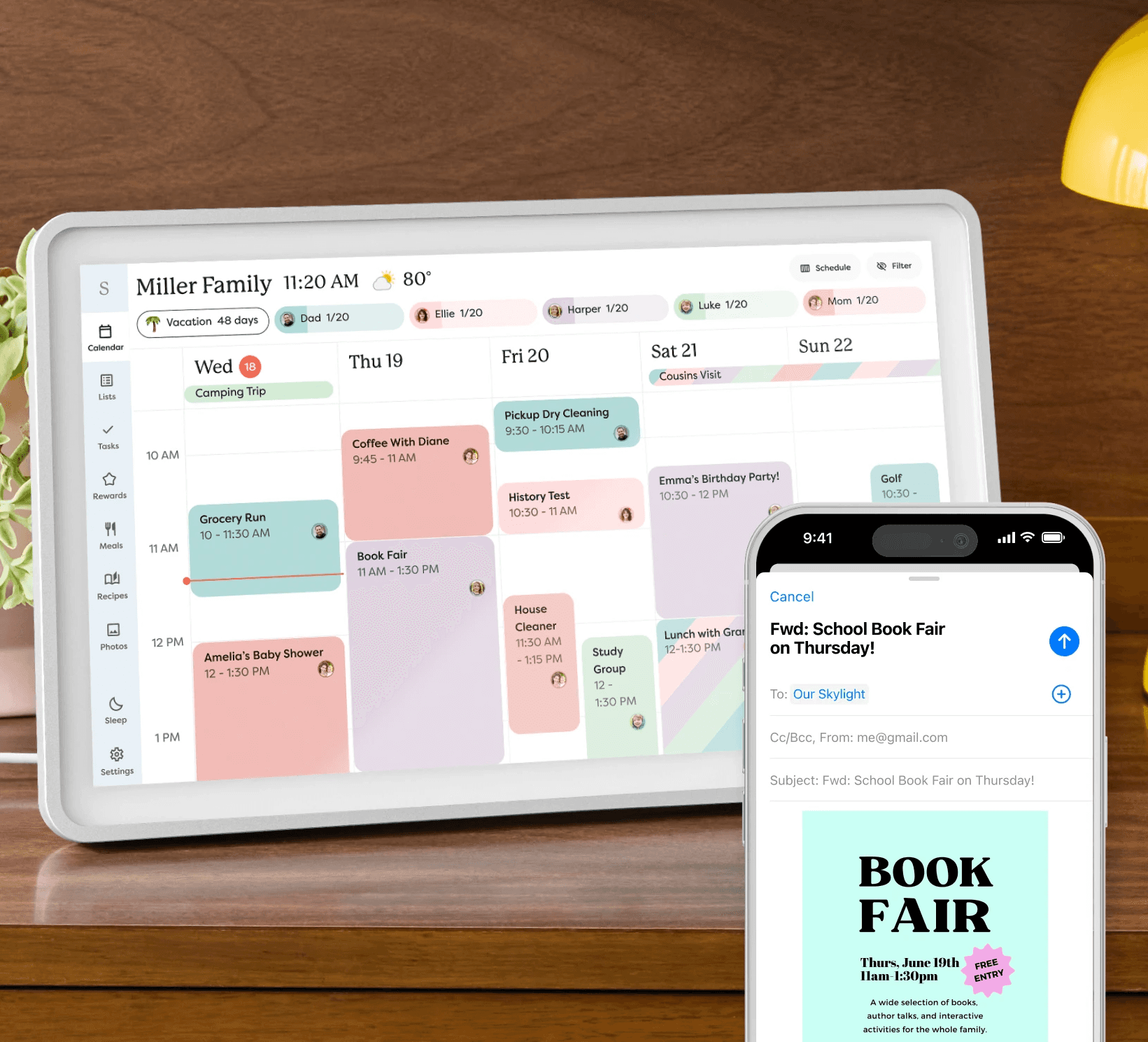 Every year it's the same thing — a paper school calendar comes home, you mean to add everything to your calendar, and then picture day sneaks up on you anyway. With Skylight's Sidekick, just snap a photo of the flier and it imports everything automatically. Same goes for forwarding an email invite. The events show up on your family calendar without you typing a single thing.